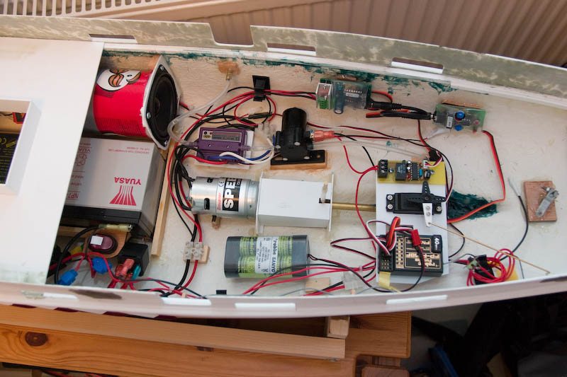 Tekniikka alkaa olla paikoillaan. Kuvassa näkyy kutakuinkin kaikki paitsi keulapotkuri ja sen nopeudensäädin. Kaiuttimen kotelo syntyy