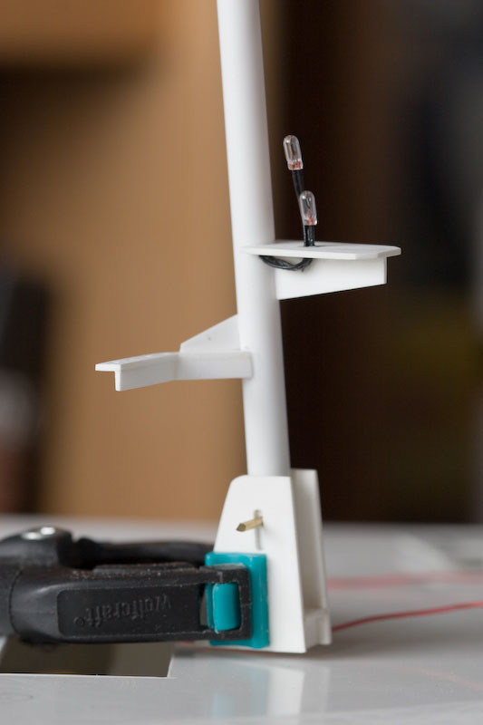 Johdot kulkuvaloille maston sisällä. Masto on kaadettavaa mallia kuljetuksen helpottamiseksi. Tällä voi säästää mallin korkeudesta n. 10 cm.